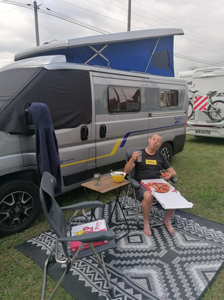 "After 'essentials' shopping, we drove a little of the route sussing out where was good. Chose our spot, 200 meters from the day's sprint. Set up camp. Opened some essentials... pasta for tea 😁 Warm shower and called it a day. Vive Le Tour."