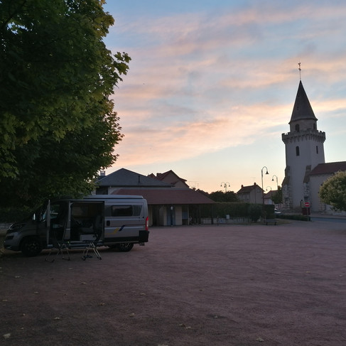 They rolled into a basic aire just before sunset, nervously wondering if there’d be any spaces left. Thankfully, they found a spot and settled in for the night.